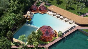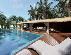 3. Exclusive Amenities artificial lagoon & beach, pools, restaurant-bar, spa, fitness center, yoga & meditation areas, and event spaces.