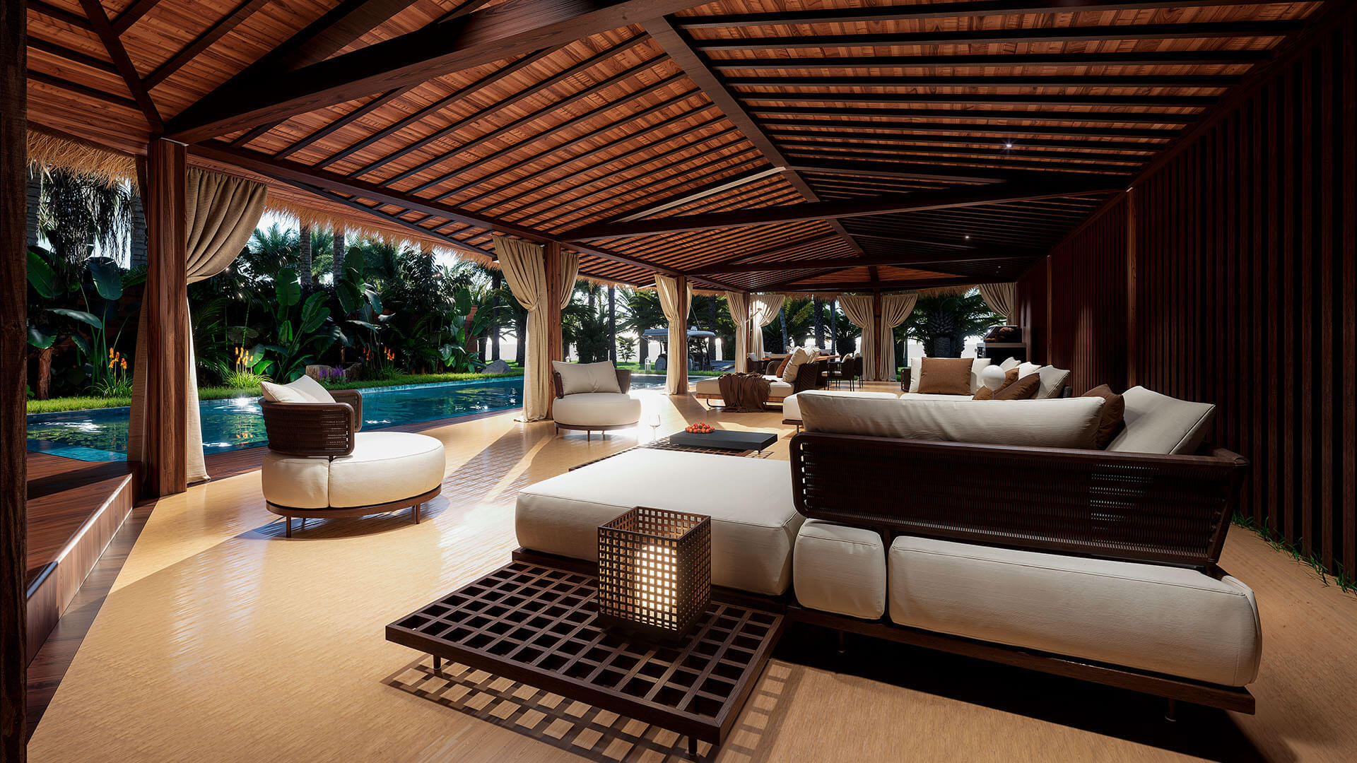 3. Exclusive Amenities artificial lagoon & beach, pools, restaurant-bar, spa, fitness center, yoga & meditation areas, and event spaces.